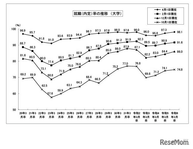 文部科学省と厚生労働省は2024年5月24日、2024年3月大学等卒業者の4月1日現在の就職状況を発表した。大学生の就職率は98.1%で、前年同期より0.8ポイント上昇し、過去最高の水準となった。