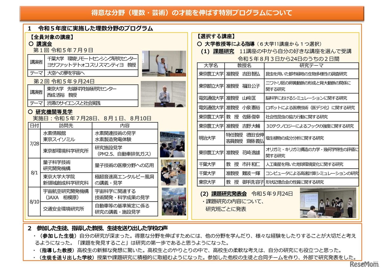 東京都教育委員会は2024年5月23日、大学などと連携しながら実施している「得意な分野(理数・芸術)の才能を伸ばす特別プログラム」の2023年度の実施状況の報告と、2024年度の開催予定を発表した。