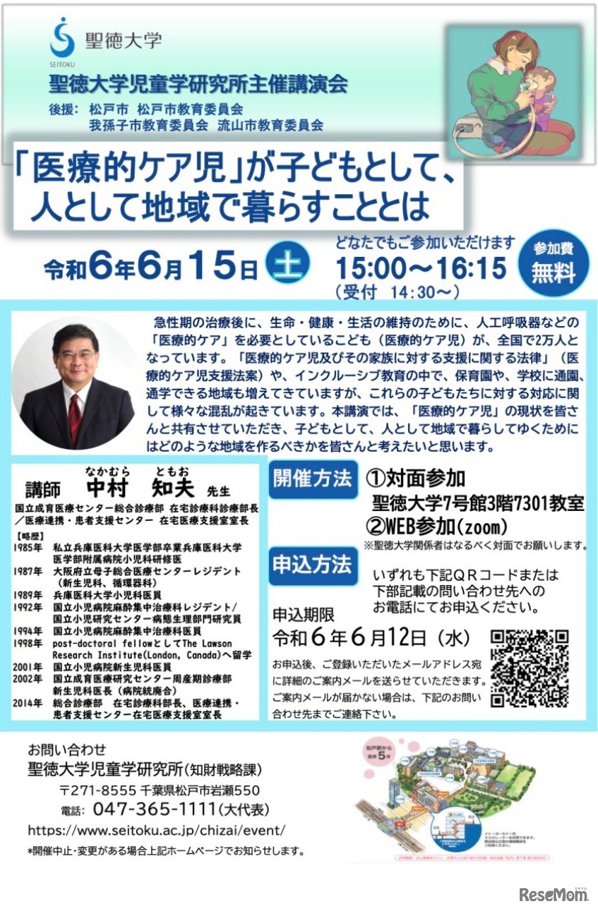 聖徳大学児童学研究所は2024年6月15日、講演会「『医療的ケア児』が子どもとして、人として地域で暮らすこととは」を、聖徳大学松戸キャンパスおよびオンラインで開催する。参加無料、事前申込制。申込フォームまたは電話にて受け付ける。