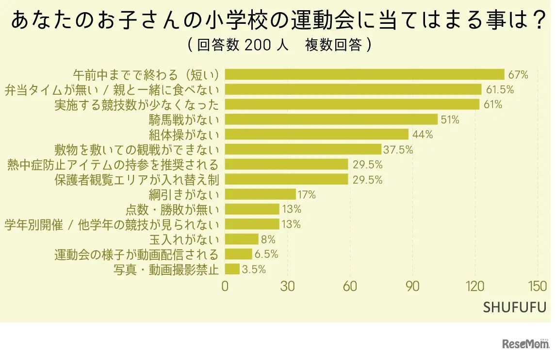 しんげんが運営する主婦向けの情報メディア「SHUFUFU」は2024年5月23日、「小学校の運動会」に関するアンケート調査の結果を公表した。運動会は6割の学校が、半日と開催時間が短くなっていることがわかった。