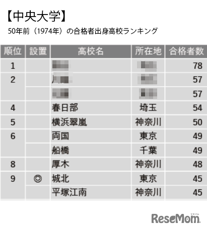 画像出典:大学通信 中央大学50年前(1974年)の合格者出身高校ランキング
