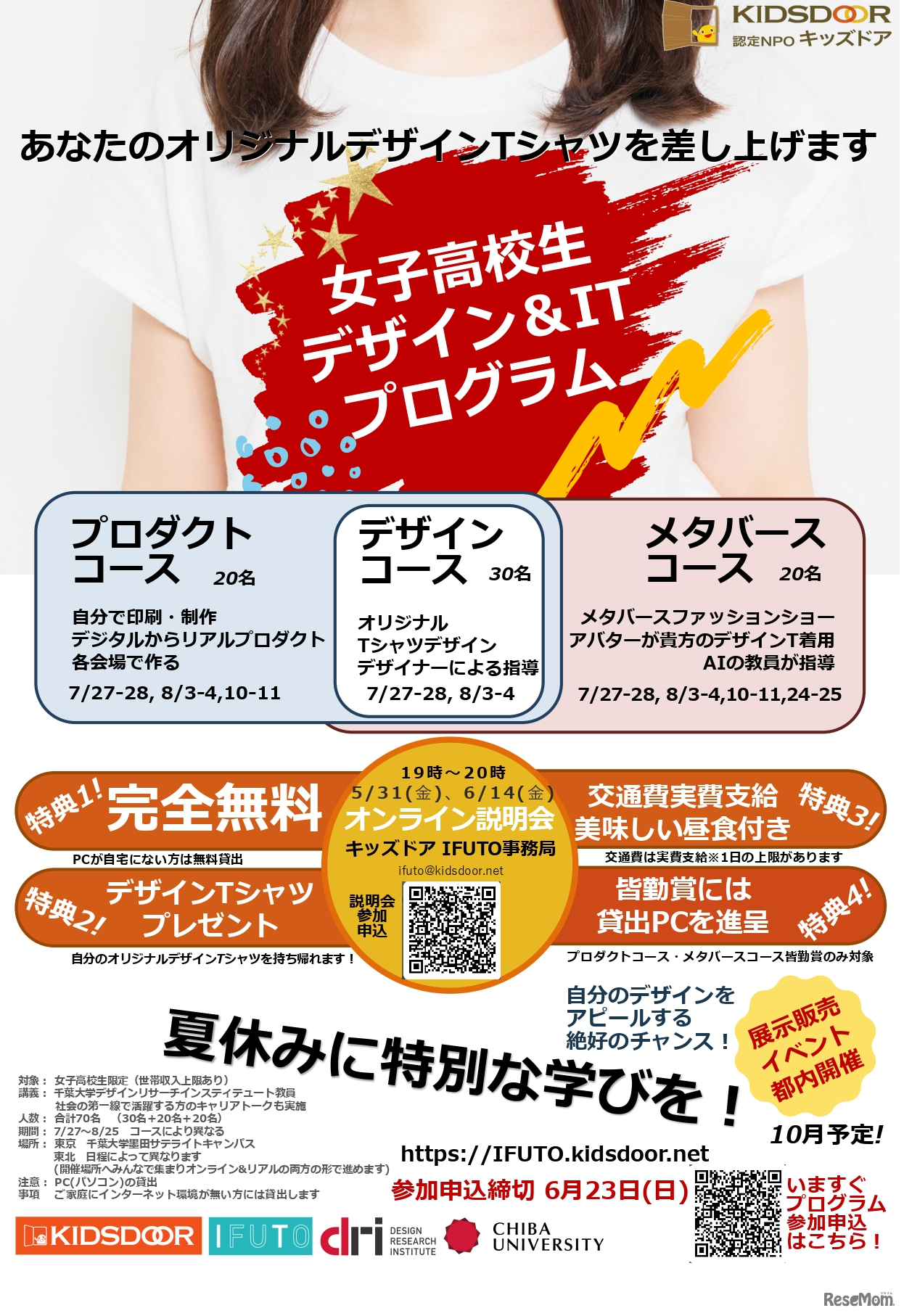 キッズドアは2024年7月から8月にかけて、デザイン&ITプログラム「IFUTO」を開催する。コースは、デザイン、プロダクト、メタバースの3つ。会場は東京と仙台。参加費無料、交通費補助あり。参加申込は6月23日まで。5月31日と6月14日にオンライン説明会を行う。
