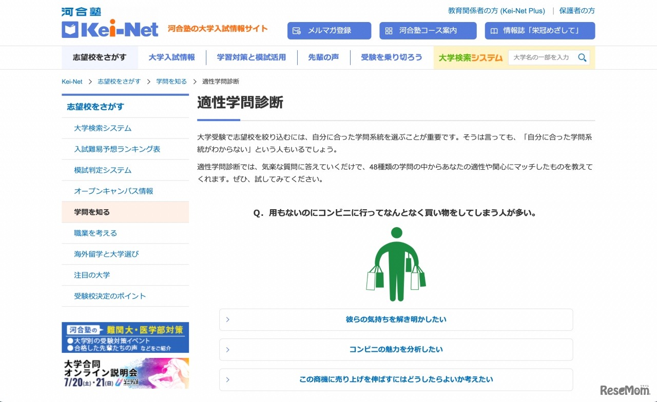 河合塾の大学入試情報サイト「Kei-Net」は2024年5月27日、コンテンツ「学問を知る」の中に「適性学問診断」を掲載した。簡単な質問に答えていくだけで、48種類の学問の中から適性や関心にマッチした学問を知ることができる。