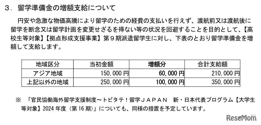 画像出典:文部科学省 第9期派遣留学生:留学準備金の増額支給について