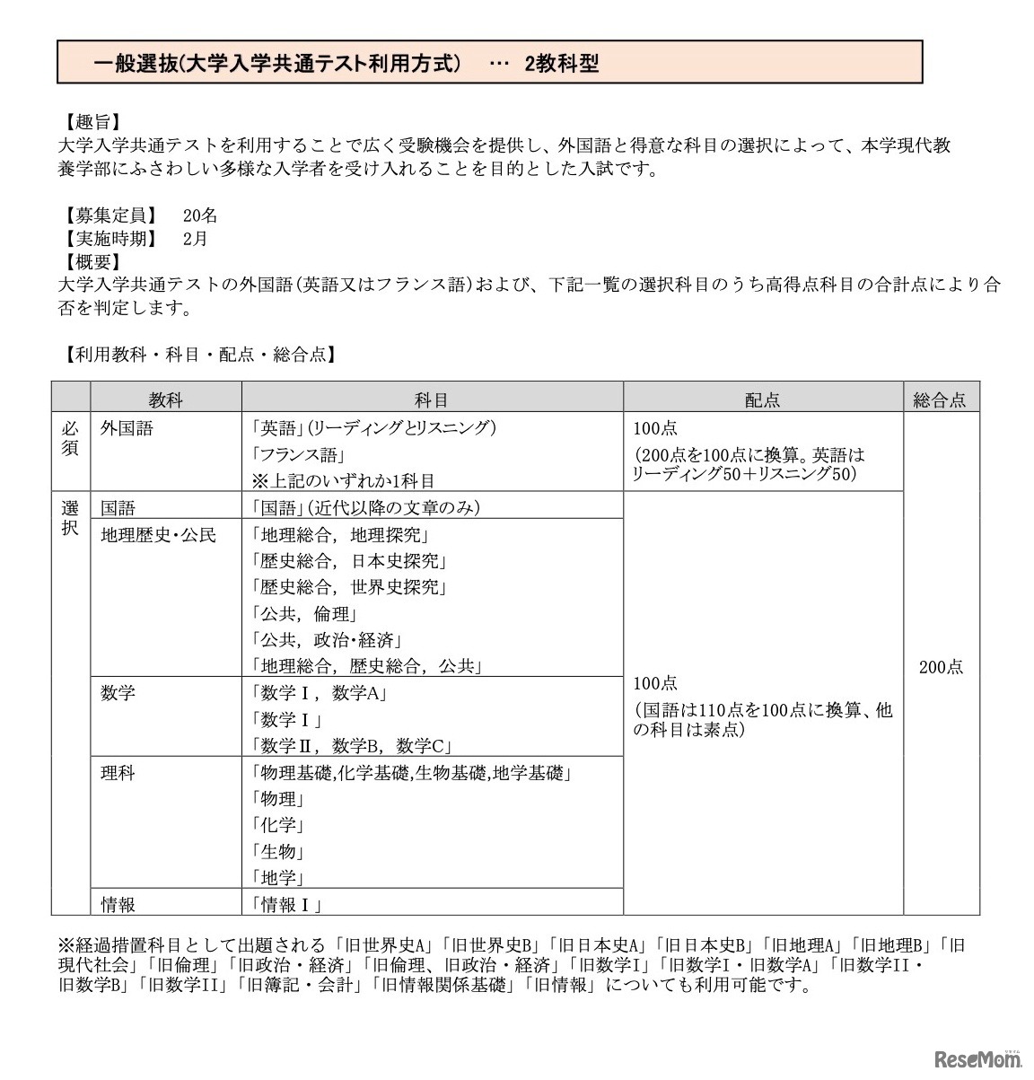 聖心女子大学は、2025年度入学者選抜より一般選抜に「大学入学共通テスト利用方式」を導入すると発表した。外国語を必須とする2教科型で実施し、旧課程履修者に対する経過措置科目として出題される科目も選択可能。