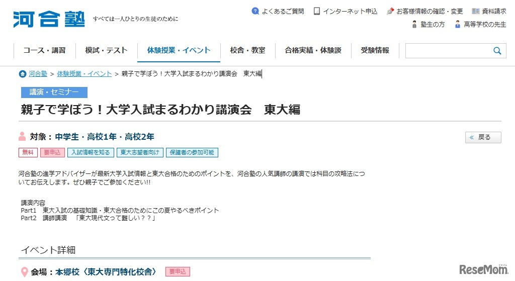 東京大学進学に専門特化した河合塾本郷校は2024年6月16日、東大志望の中1~高2生とその保護者を対象に「親子で学ぼう‼大学入試まるわかり講演会-東大編-」を開催する。東大入試で問われる力や、受験学年までに何をすれば良いかなどを講演する。参加無料。申込期限は6月15日午後5時59分。
