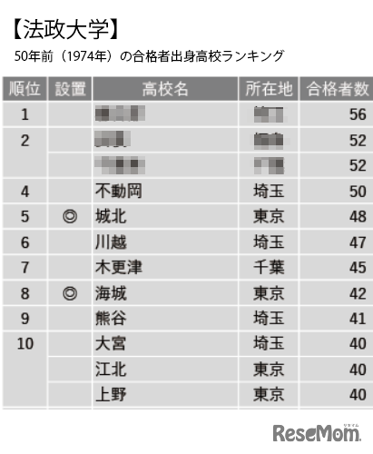 画像出典:大学通信 法政大学50年前(1974年)の合格者出身高校ランキング