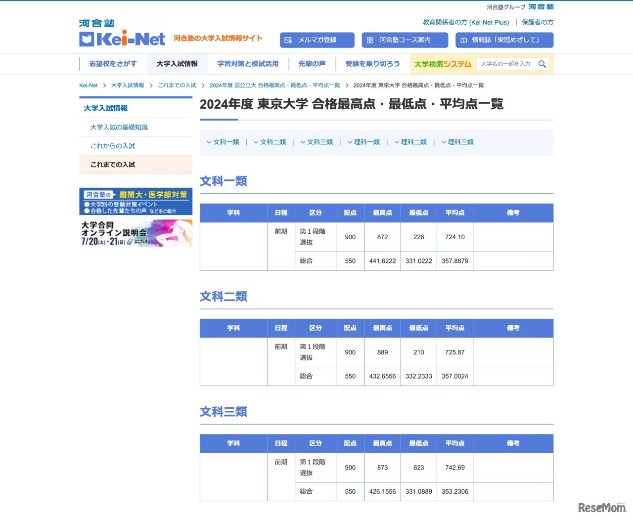 河合塾の大学入試情報サイト「Kei-Net」は2024年5月31日、「2024年度 国公立大入試合格最高点・最低点・平均点一覧」を掲載した。国公立大学一般入試合格者の最高点・最低点・平均点について、大学や学部・学科別に一覧にまとめて紹介している。