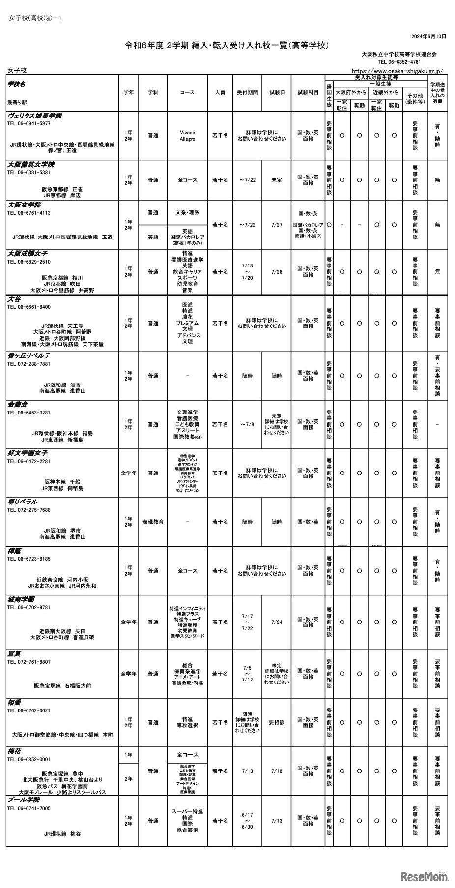 画像出典:大阪私立中学校高等学校連合会 令和6年度 2学期 編入・転入受け入れ校一覧(高等学校)女子校