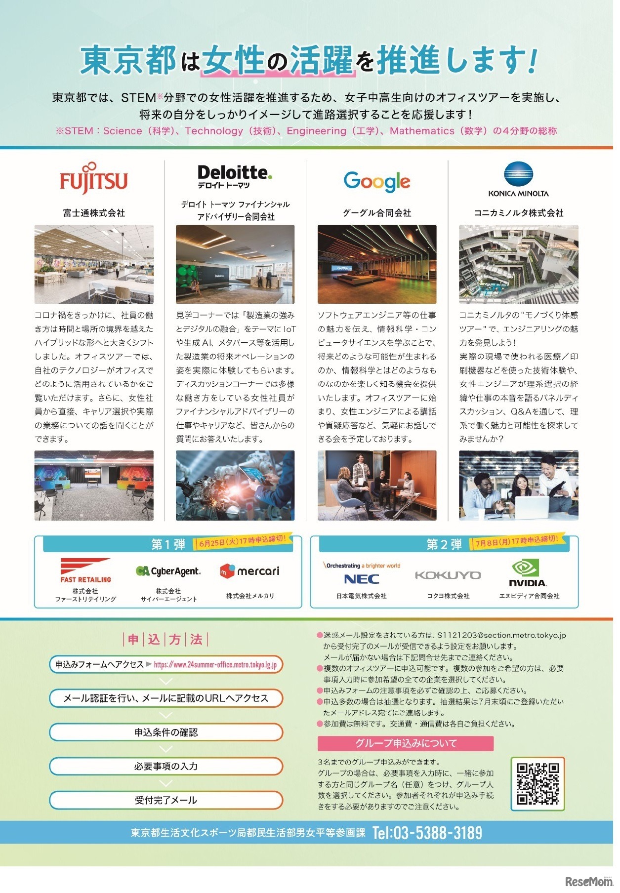 東京都は2024年8月、STEM分野での女性活躍を推進するため「女子中高生向けオフィスツアー!第3弾」を開催する。8月22日に富士通、8月27日にデロイト トーマツ、8月29日にグーグル、8月30日にコニカミノルタを訪問する。参加無料。対象は都内在住または在学の女子中学生、女子高校生。申込期限は7月24日。抽選制。
