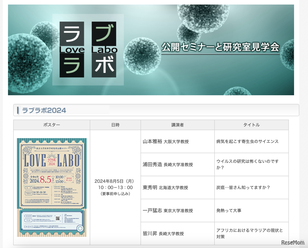 東京大学医科学研究所は2024年8月5日、北海道大学、大阪大学、長崎大学と共催し、医科学研究所公開セミナー「ラブラボ2024」を開催する。参加費無料。定員140名。締切りは8月2日。
