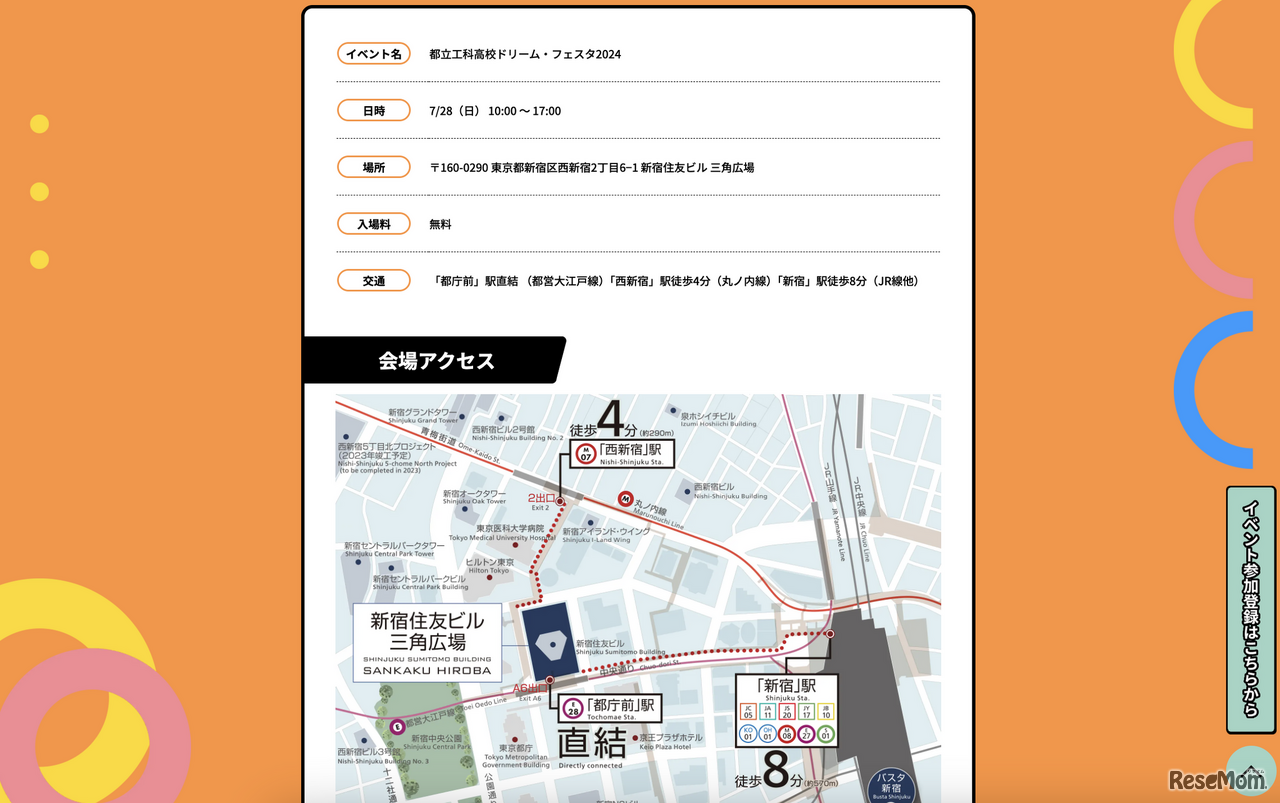 東京都教育委員会は2024年7月28日、小中学生や保護者を対象に、都立工科高校生と交流できる「都立工科高校ドリーム・フェスタ2024」を新宿住友ビル三角広場にて開催する。当日は、著名人や人気タレントが参加するステージイベントを開催するという。入場無料。