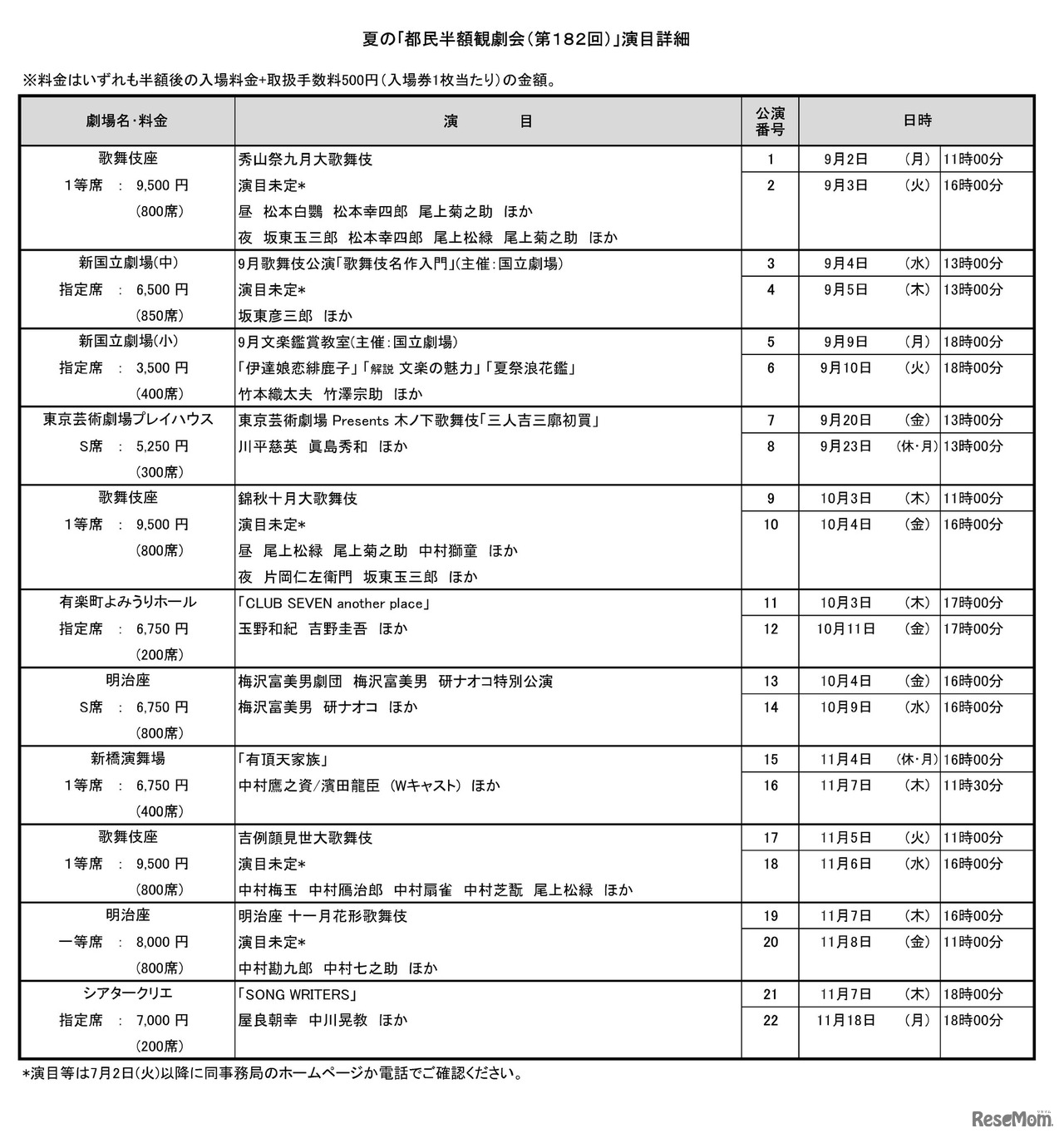 東京都と東京都歴史文化財団、日本演劇興行協会、都民劇場は、2024年9月2日より、歌舞伎座「秀山祭九月大歌舞伎」などの11劇場22公演が半額で観劇できる、夏の「都民半額観劇会」を開催する。提供数は合計6,350席。はがきで申し込む。申込締切は7月14日(消印有効)。