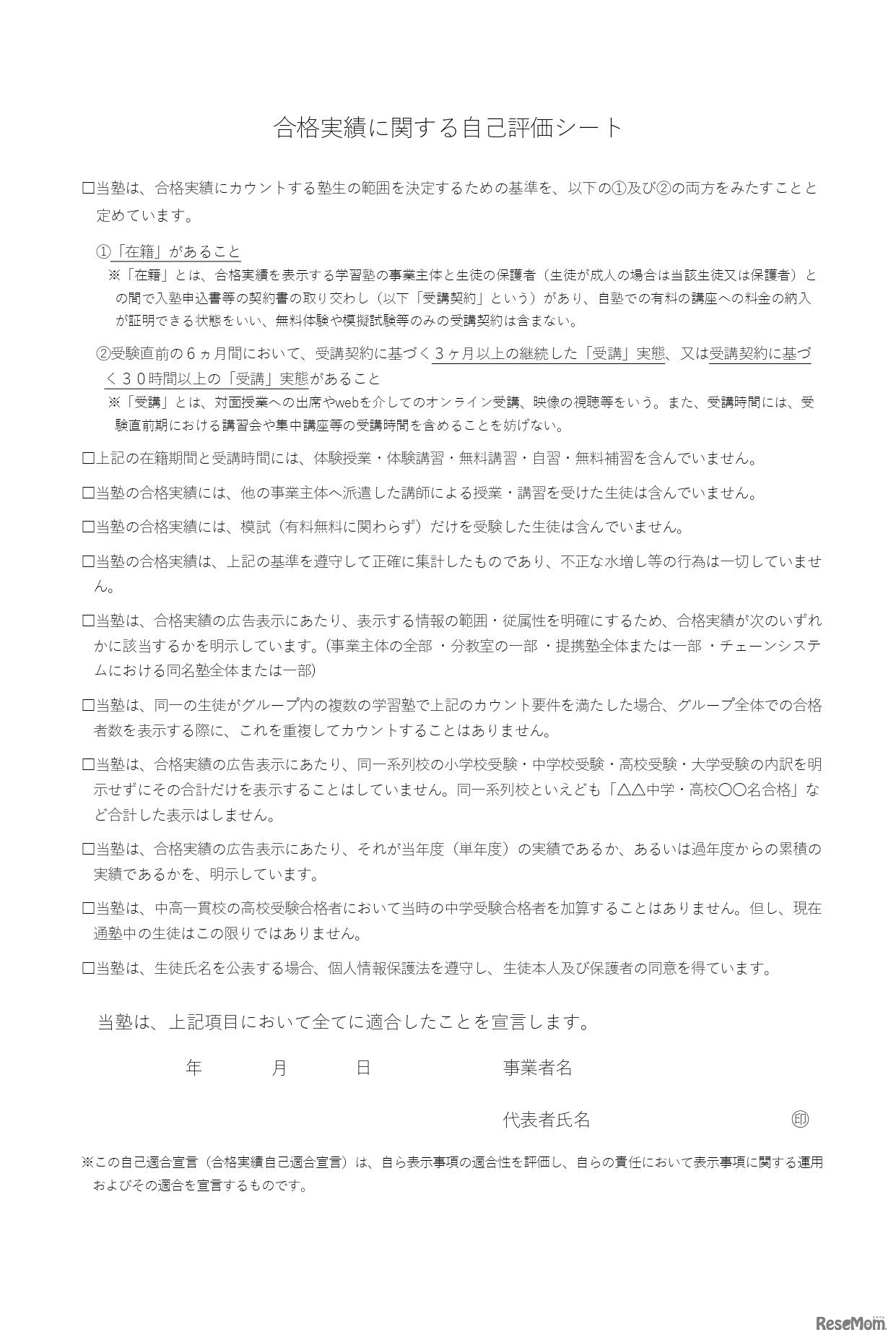 全国学習塾協会は2024年7月1日、「合格実績」に関する自主基準の改正について、全国の塾事業者へ周知した。合格実績に含むことのできる塾生の範囲を「受験直前の6か月のうちいずれかに在籍し、30時間以上の受講、または継続的に3か月以上の受講がある生徒」と規定した。