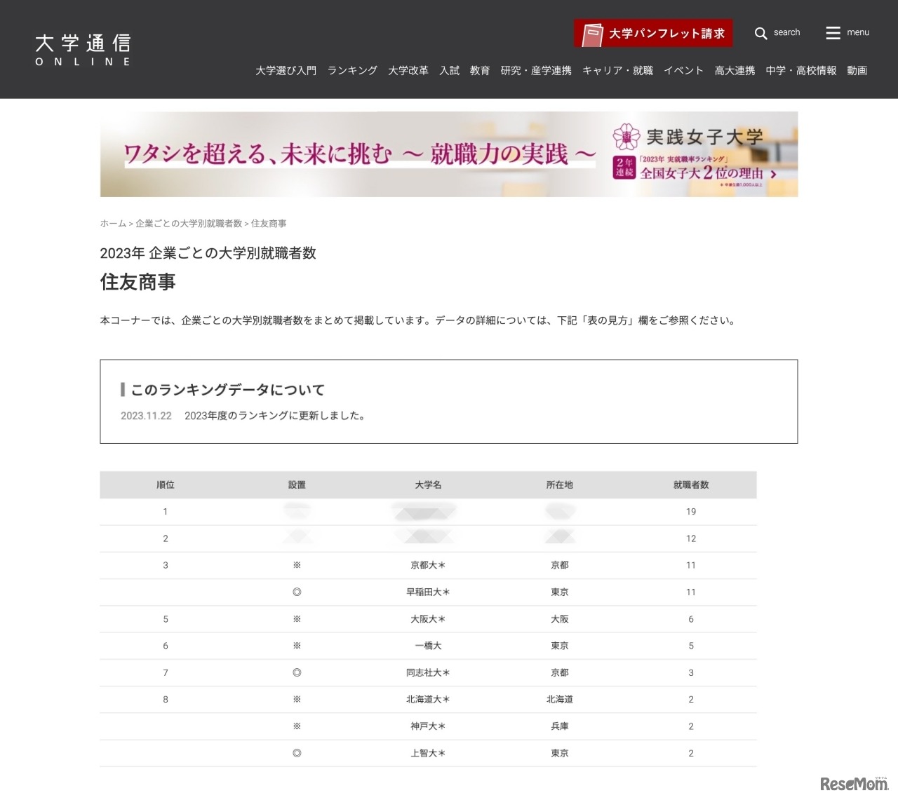 大学通信は、2023年の企業ごとの大学別就職者数をランキング形式で発表している。第6弾は「商社」から、三菱商事、三井物産、伊藤忠商事、住友商事、丸紅の5大商社の大学別就職者数を紹介する。3位には東京大学、大阪大学、京都大学などがランクイン。1位・2位は大学通信のWebサイトから確認できる。
