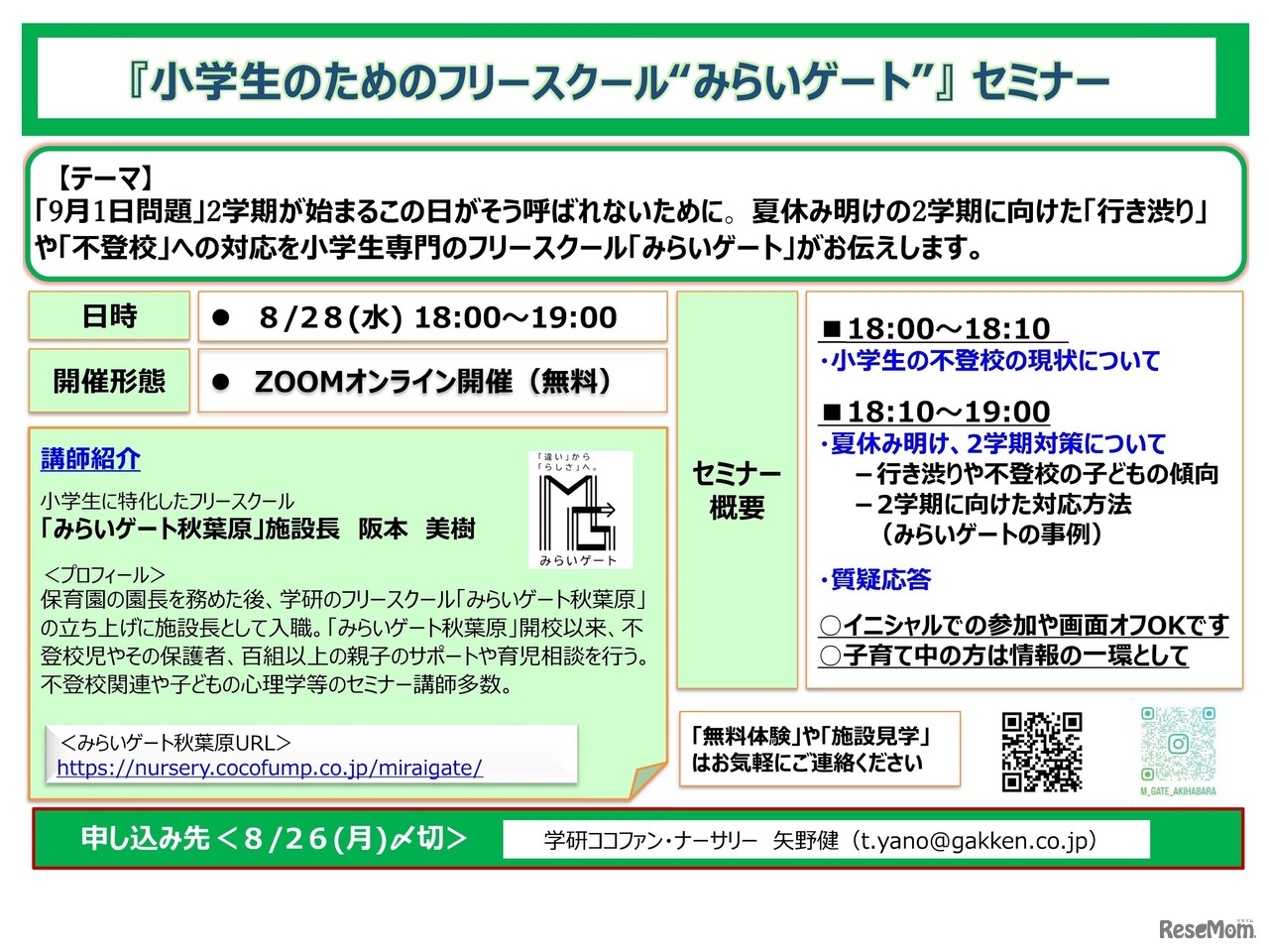 小学校専門のフリースクール「みらいゲート」は、2学期に向けて保護者向けのセミナーを2024年8月28日にオンラインで開催する。子供への対応方法を事例をあげながら解説する。参加費無料。事前予約制。