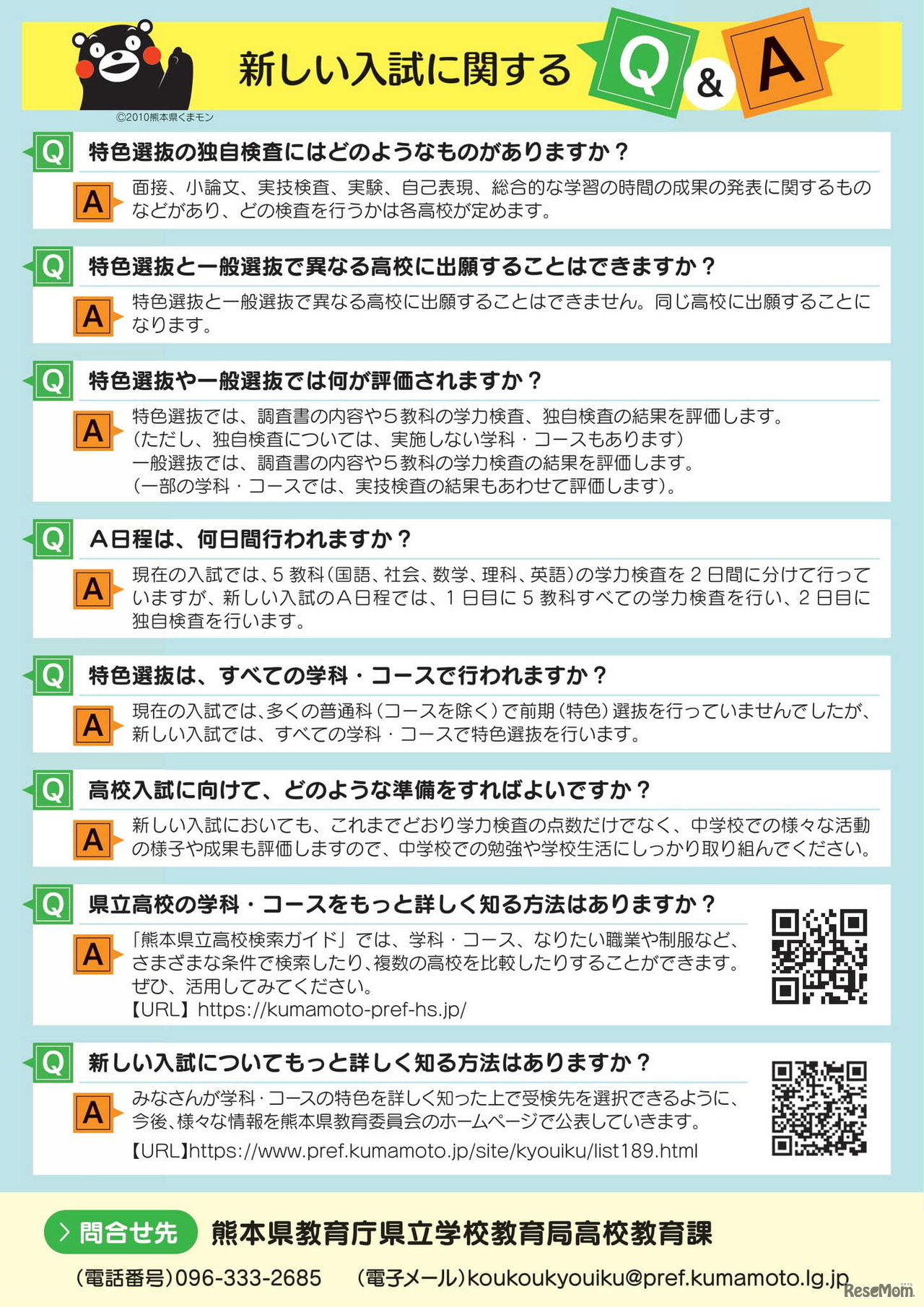 熊本県教育委員会は2024年7月31日、2027年度(令和9年度)入学者選抜から実施する、新しい熊本県立高等学校入学者選抜制度のチラシをWebサイトに公表した。現在の前期(特色)選抜と後期(一般)選抜を1回にまとめて「A日程」とし、現在の二次募集を「B日程」とする。