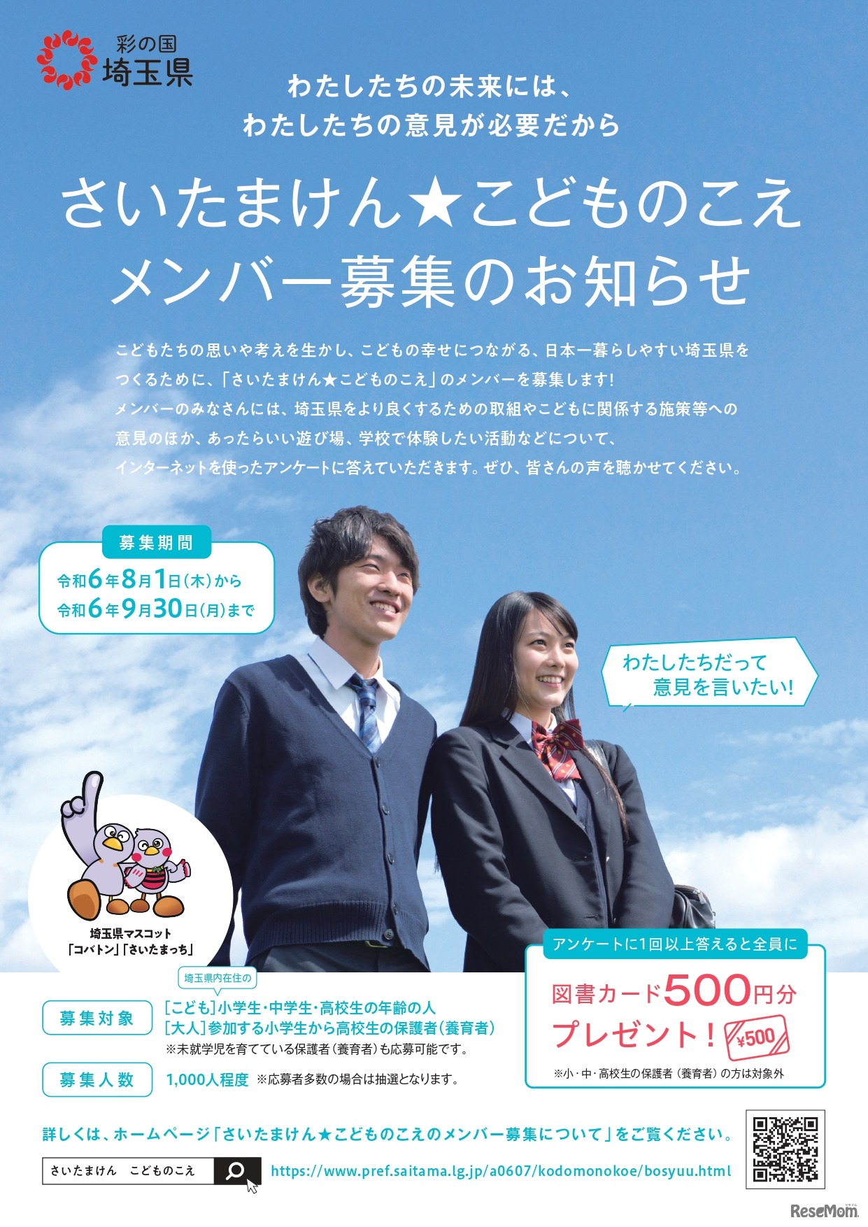 埼玉県は8月1日から9月30日まで、県政等に関するWebアンケートへ回答し、子供たちの今を動かす、未来をつくる「さいたまけん★こどものこえメンバー」を1,000人程度、募集している。対象は、埼玉県在住の小中高生や保護者など。募集人数を超える場合は、抽選となる。