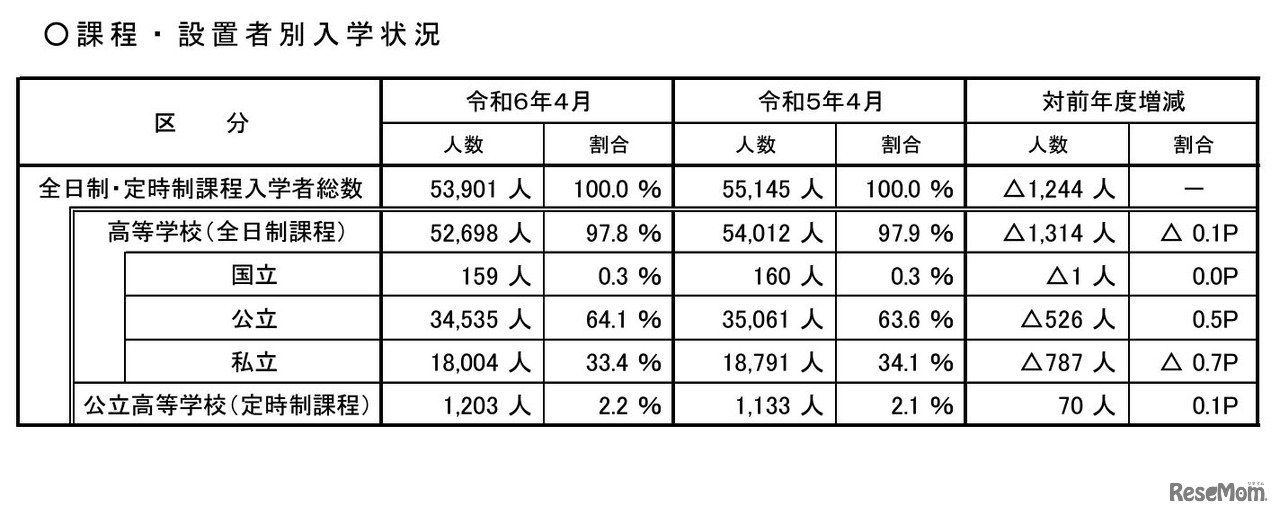 画像出典:埼玉県「令和6年4月高等学校入学状況調査(速報)」 課程・設置者別入学状況(全日制・定時制課程)