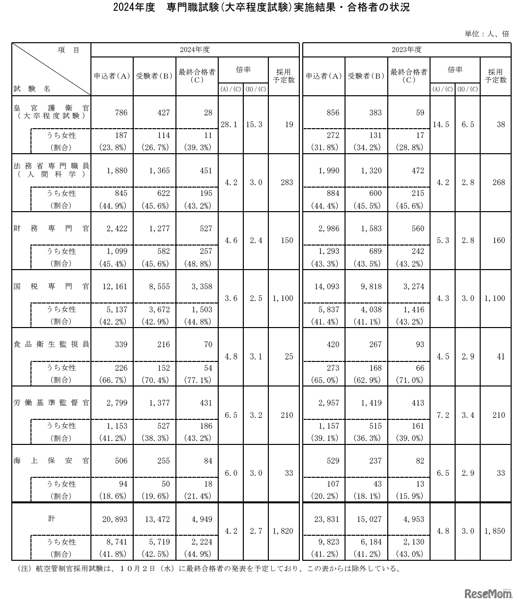 人事院は2024年8月13日、2024年度国家公務員採用一般職試験(大卒程度)と専門職試験(大卒程度)の合格者を発表した。受験倍率は一般職試験が2.3倍、専門職試験は皇宮護衛官(大卒程度)15.3倍がもっとも高く、7種類合計の倍率は2.7倍となった。