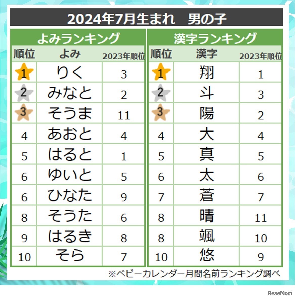 画像出典:ベビーカレンダー 2024年7月生まれ 男の子に人気の名前のよみ・漢字ランキング