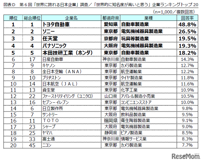 画像出典:リスクモンスター 第6回「世界に誇れる日本企業」調査/「世界的に知名度が高いと思う」企業ランキングトップ20