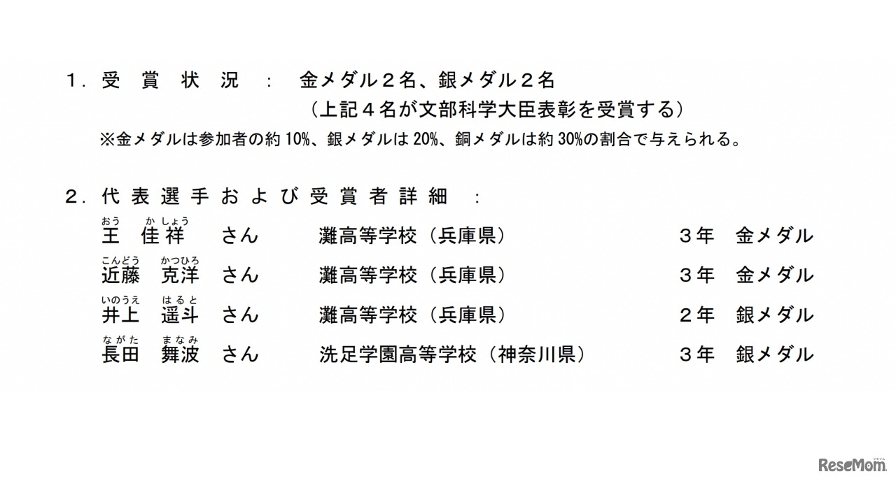 2024年8月8日~16日(日本時間)に開催された「第17回国際地学オリンピック」において、日本代表として参加した高校生4人全員がメダルを獲得。金メダル2人、銀メダル2人と優秀な成績を収めた。結果を表彰し、4人は文部科学大臣表彰の受賞者となることも決定した。