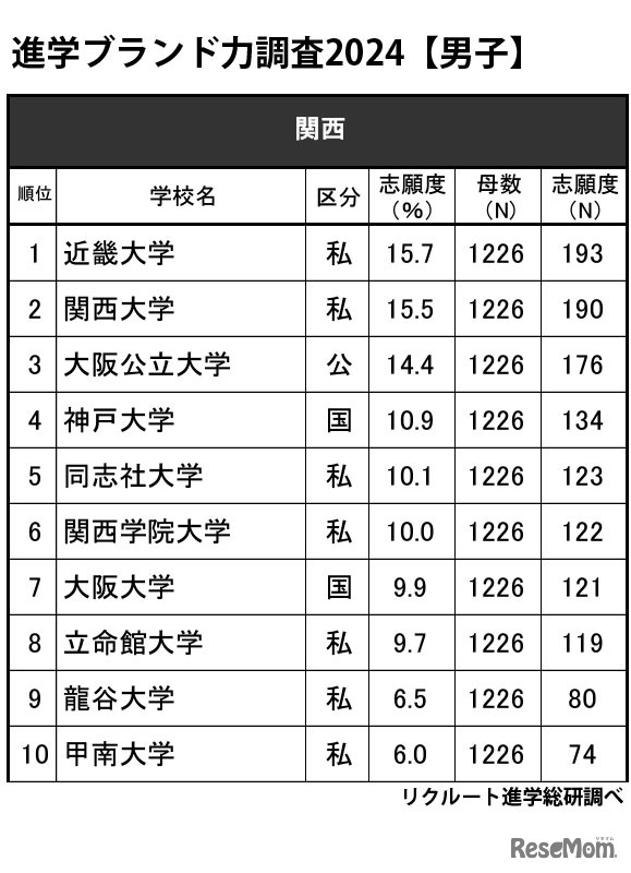 リクルート進学総研の「進学ブランド力調査2024」の結果、高校生が志願したい大学の関西エリア1位は「関西大学」、2位は「大阪公立大学」、3位は「近畿大学」。男女別にみると、男子1位は「近畿大学」、女子1位は「関西大学」となった。