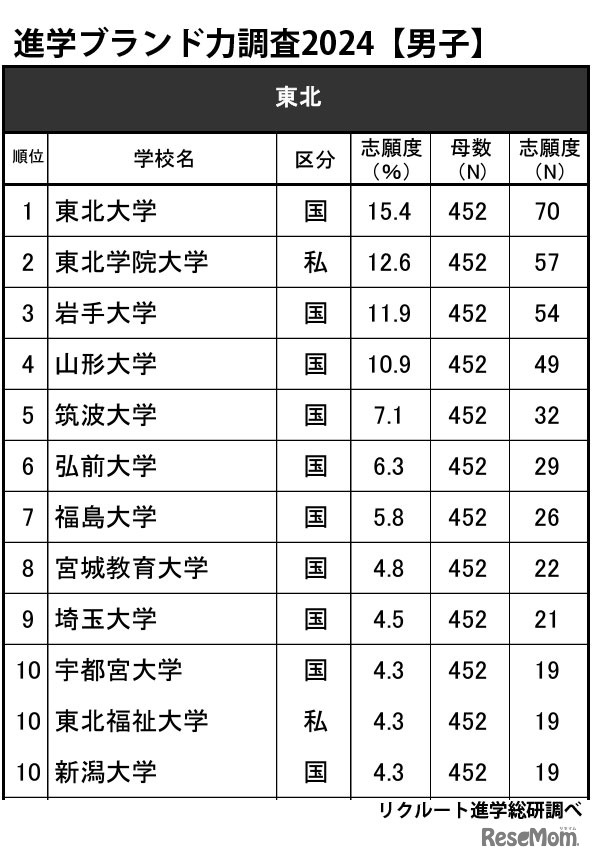 リクルート進学総研の「進学ブランド力調査2024」の結果、東北の高校生が志願したい大学1位は「東北大学」、2位「東北学院大学」、3位「山形大学」。男女別にみると、男子1位は「東北大学」、女子1位は「東北学院大学」となった。