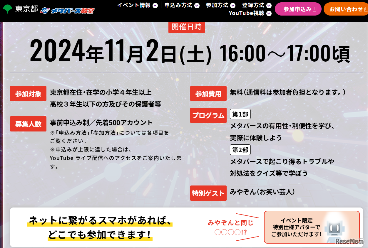 東京都は2024年11月2日、今年オープンしたメタバースプラットフォーム「cluster」内「Virtual Edo-Tokyo」にて、親子で一緒にメタバースの便利さや楽しさを体験する教室を開催する。対象は都内在住の小学4年~高校3年生とその保護者。参加は無料。
