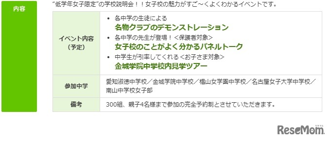 日能研東海本部は2024年10月14日、小学1~3年生の女子と保護者を対象に「私立中学へ行ってみよう会」を開催する。愛知淑徳中学校・金城学院中学校・椙山女学園中学校・名古屋女子大学中学校・南山中学校女子部の5校が集う。定員300組、親子4名まで。10月13日午後1時まで、先着・事前申込制。