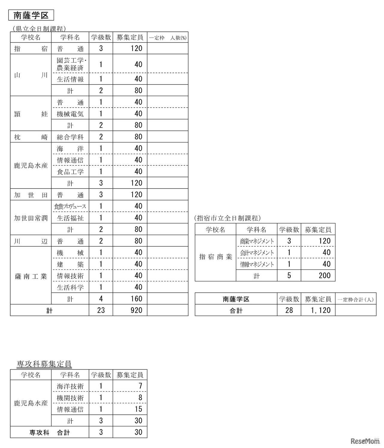 画像出典:鹿児島県教育委員会 令和7年度公立高等学校生徒募集定員