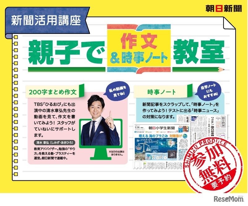朝日新聞社は、小中学生の親子向け無料イベント「親子で作文&時事ノート(スクラップ)教室」を全国で開催している。開催が決定したイベント情報はWebサイトで公開されており、希望会場を選択して申し込む。