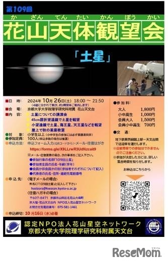 京都大学理学研究科附属天文台と花山星空ネットワークは2024年10月26日、小学生以上を対象に天体観望会「土星」を花山天文台にて開催する。定員100名。小中学生は保護者同伴。参加費は大人1,800円、小中高生1,000円。申込み多数の場合は抽選となる。申込期限は10月16日。