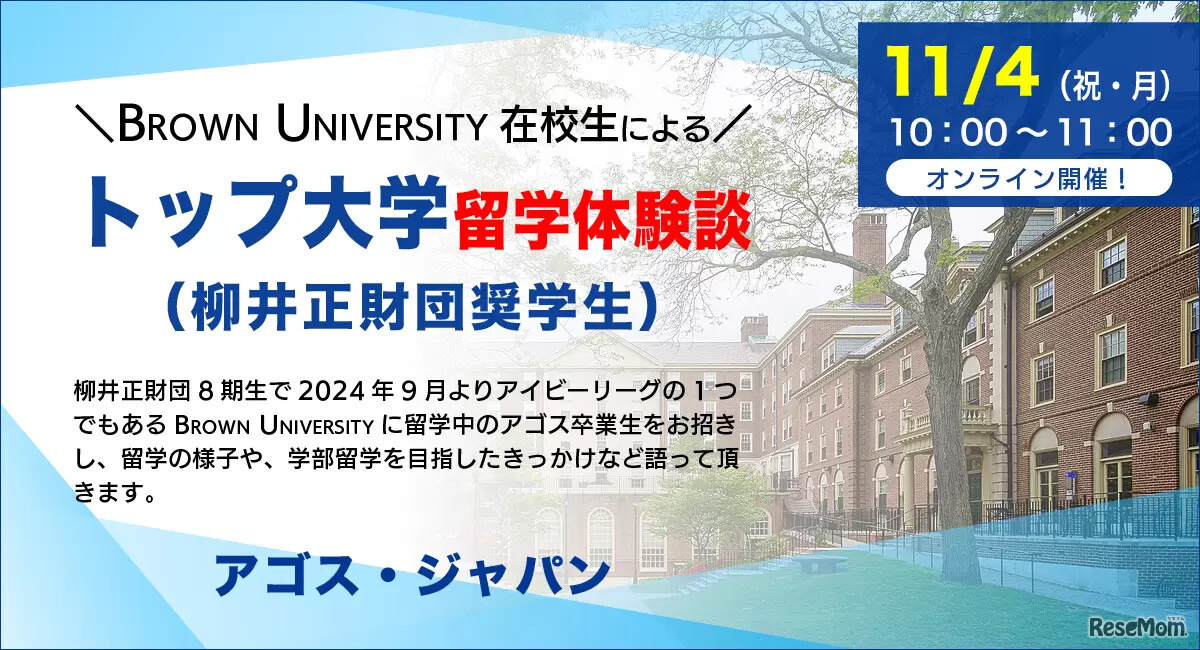 海外トップ大学・大学院留学準備指導校のアゴス・ジャパンは2024年11月4日、オンラインセミナー「【学生対象】トップ大学留学体験談~Brown University(柳井正財団奨学生)」を開催する。留学準備の道のりや成功の秘訣などを語る。参加無料。事前申込制。