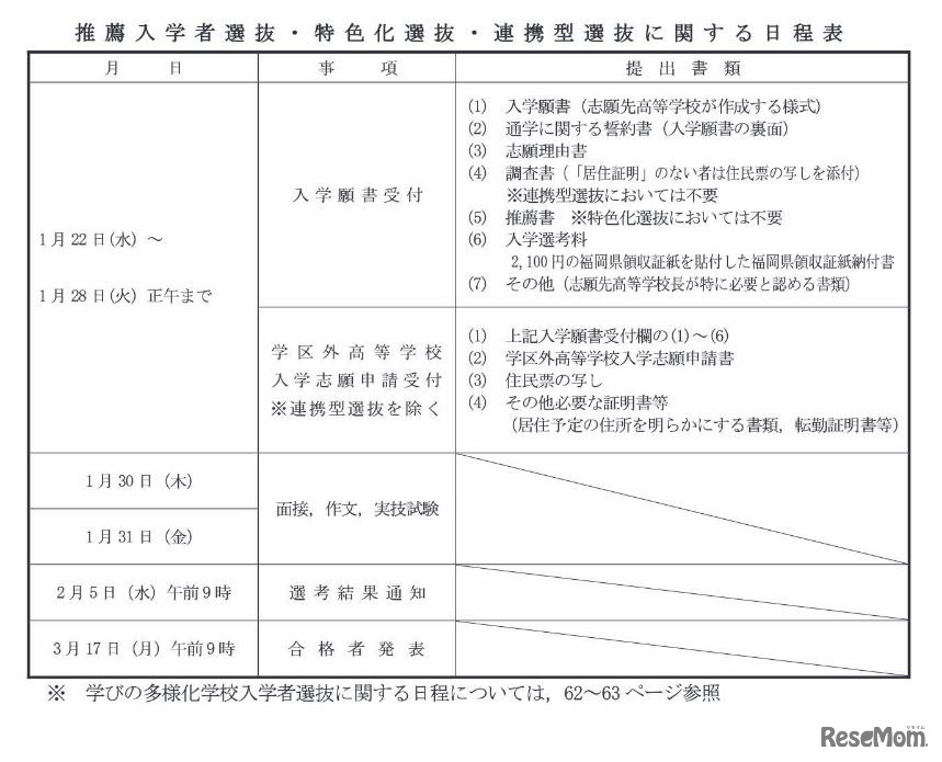 推薦入学者選抜、特色化選抜、連携型選抜に関する日程表