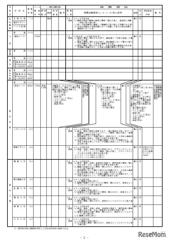 富山県教育委員会は2024年10月18日、2025年度(令和7年度)富山県立高等学校入学者選抜実施概要一覧を公表した。全日制は34校のうち、27校62学科で推薦選抜を実施する。全日制全体の募集人員は前年度(2024年度)比82人減の6,024人、このうち推薦選抜は1,190人。