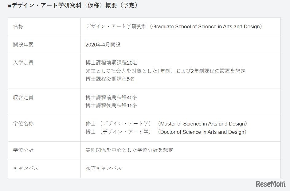 立命館大学は、2026年4月にデザイン・アート学部と大学院デザイン・アート学研究科(仮称)を京都・衣笠キャンパスに開設予定であると発表した。入学定員は学部が180名、研究科の博士課程前期課程が20名、博士課程後期課程が5名を想定している。