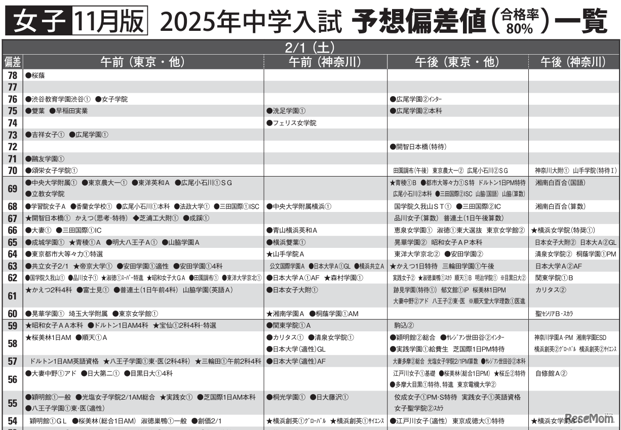 予想偏差値一覧(11月版)女子2月1日