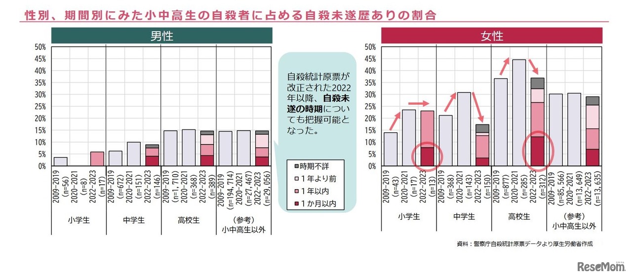 政府は2024年10月29日、2024年版「自殺対策白書」を閣議決定した。2023年の小中高生の自殺者は513人で、過去最多となった2022年と同水準で推移。自殺の原因・動機では、「家族からのしつけ・叱責」は小学生、うつ病や精神疾患は女子高校生に多い傾向にある。