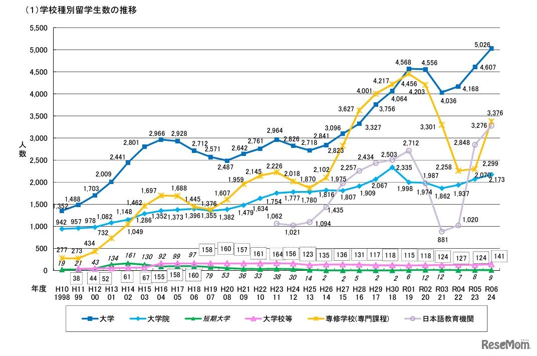 画像出典:神奈川県「令和6年度神奈川県内大学等在籍留学生調査結果」 学校種別留学生数の推移