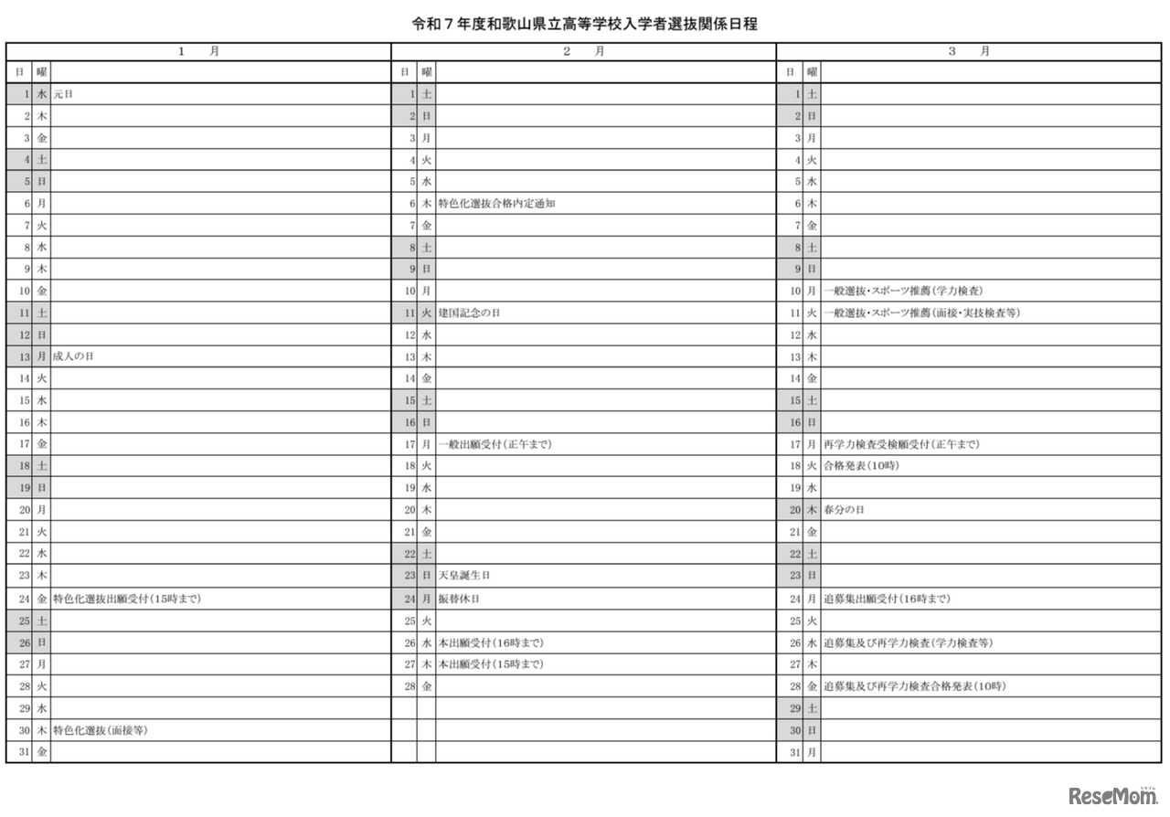 令和7年度和歌山県立高等学校入学者選抜関係日程