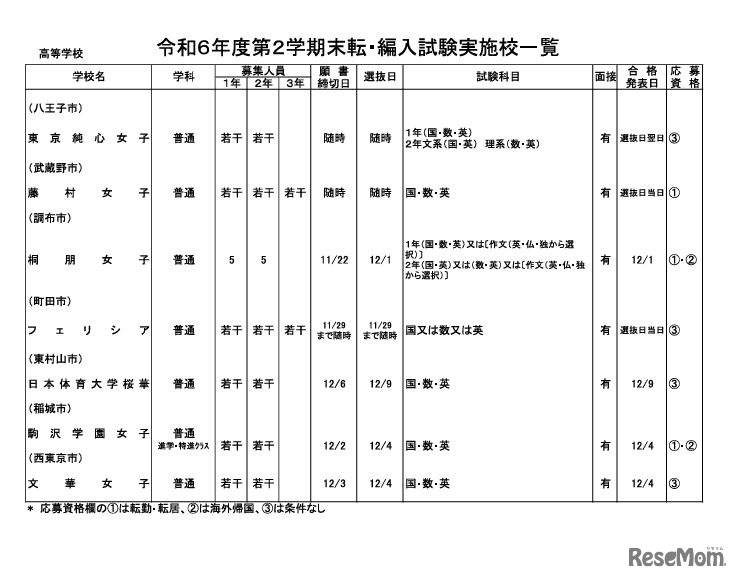 画像出典:東京都生活文化スポーツ局私学部 令和6年度第2学期末転・編入試験実施校一覧(全日制高校・女子校)
