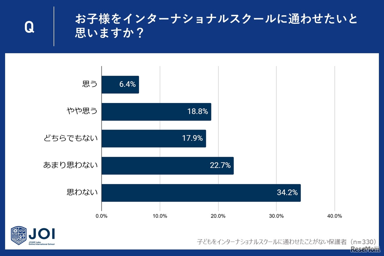 じゅけラボOnlineインターナショナルスクールJOIは、インターナショナルスクールに子供を通わせたことがない保護者330人を対象に、インターナショナルスクールに関する興味関心度についてアンケート調査を実施した。調査の結果、約57%の保護者がインターナショナルスクールへの通学に消極的である一方、約25%が関心を示していることが明らかになった。
