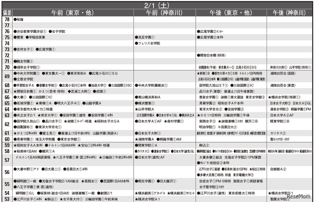 画像出典:首都圏模試センター 予想偏差値12月版(女子・2月1日)
