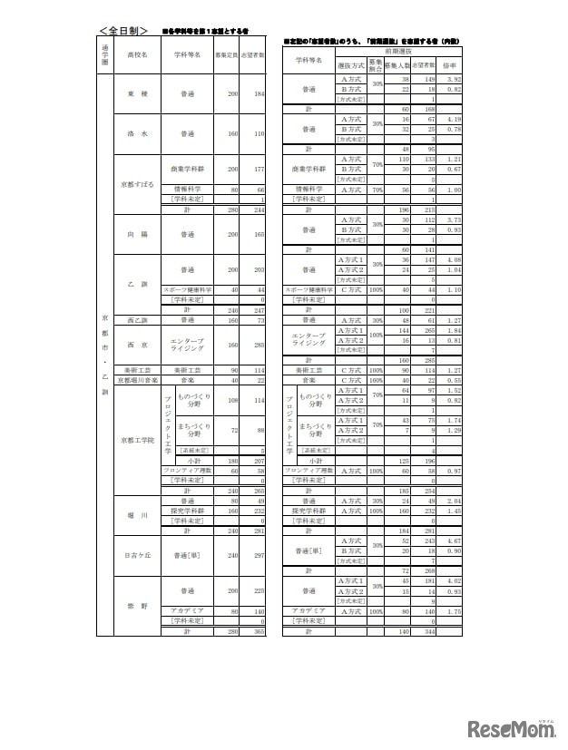 画像出典:京都府教育委員会「令和7年3月中学校および特別支援学校中学部等卒業予定者の進路希望状況」 公立高等学校 学校別・学科別志望状況<全日制>