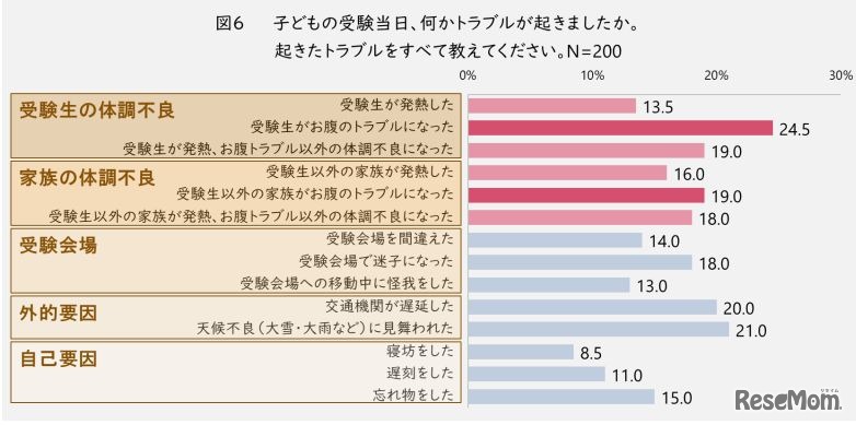 大幸薬品は2024年12月5日、2年以内に子供の受験を経験した保護者1,000名を対象に「子供の受験に関する意識調査」について発表した。調査の結果、受験当日にもっとも多く発生したトラブルは「受験生の体調不良」であり、特に「お腹のトラブル」が多かったことが明らかになった。また、受験生以外の家族も体調不良を訴えるケースが多く、受験が家族全体に影響を及ぼすことがわかった。