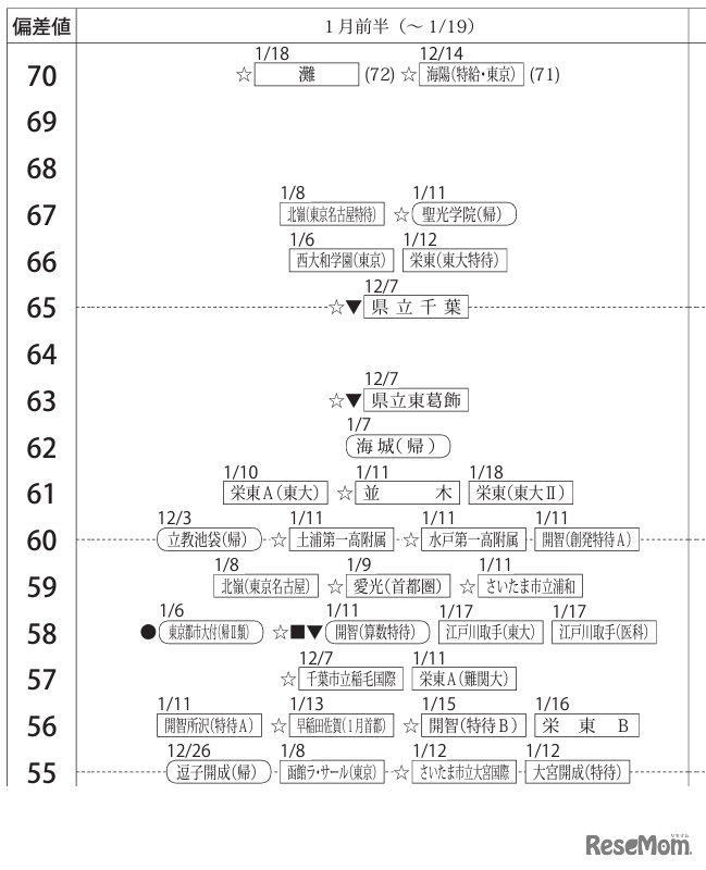 リセマムは、四谷大塚が2024年12月1日に実施した小学6年生対象「第6回合不合判定テスト」の結果をもとにした偏差値データを入手、一覧を公開した。難関校の合格可能性80%偏差値は、男子が開成(71)、筑波大駒場(73)、女子が桜蔭(71)、渋谷教育渋谷2(71)など。