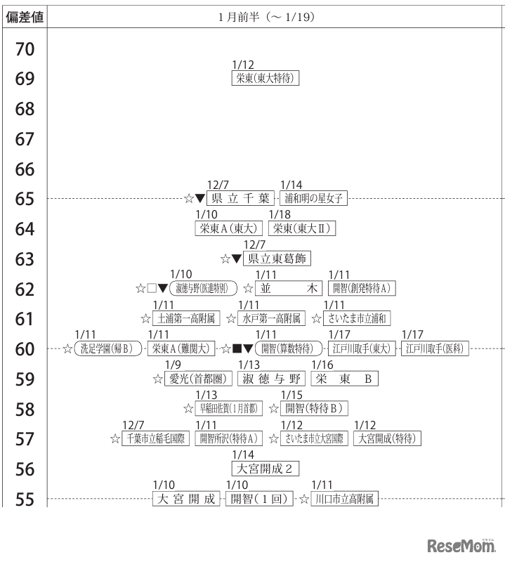 画像出典:四谷大塚「合不合判定テスト(第6回)Aライン80偏差値一覧」 女子1月前半