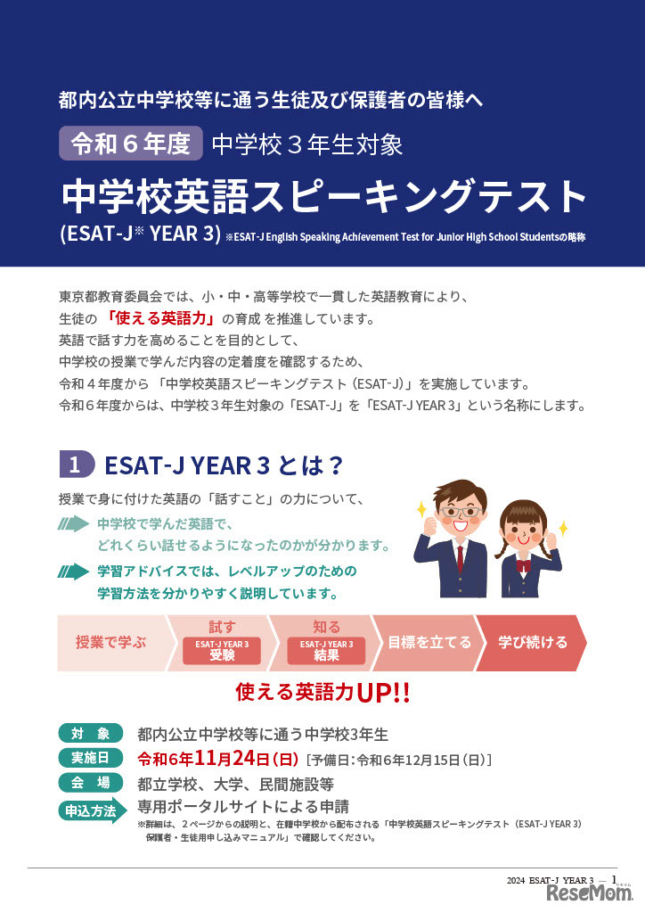 東京都の中学校英語スピーキングテスト(ESAT-J)予備日試験が2024年12月15日、都立学校など全15会場で実施され、申込者約1,400人のうち約900人が受験した。試験問題と解答例は12月16日午後5時ごろ、東京都教育委員会Webサイトに公開予定。